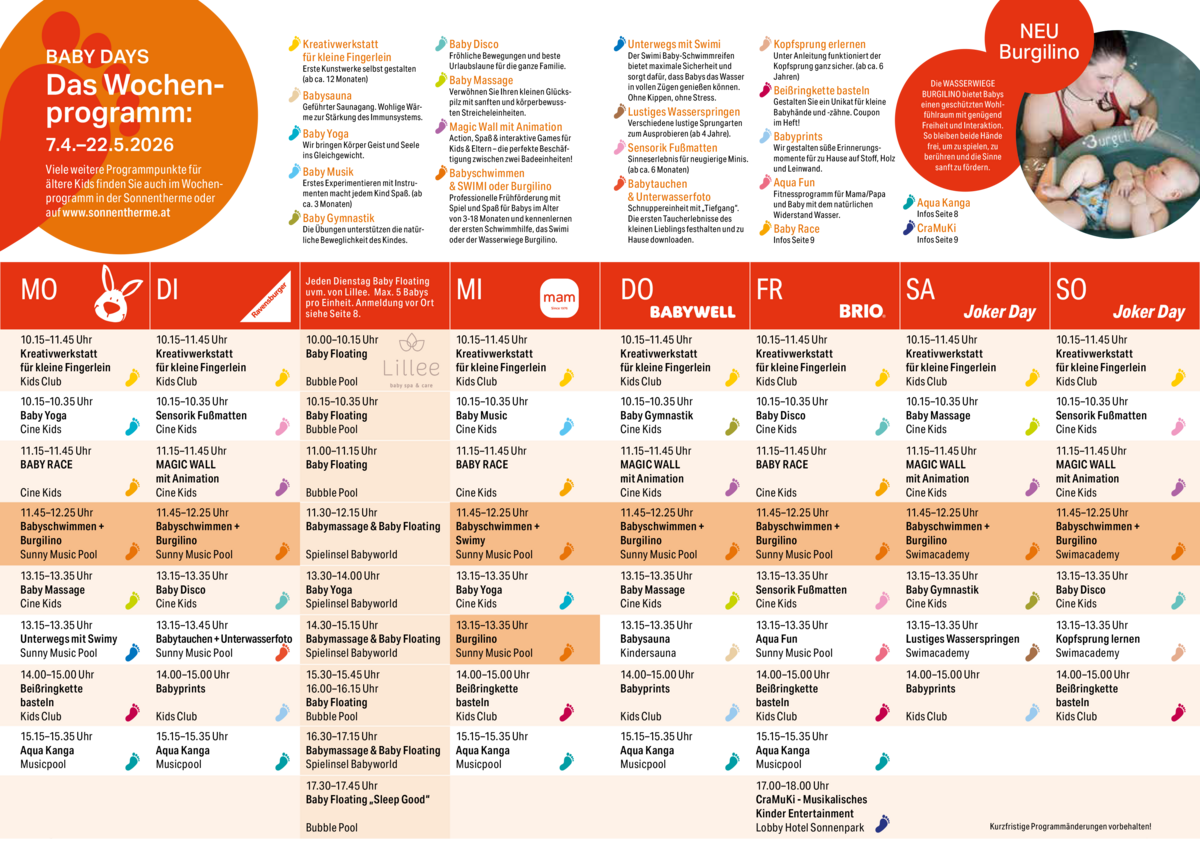 Die Bindung zum Baby stärken und es dabei gleichzeitig verwöhnen. Sie erlernen Massagegriffe, die sehr leicht in den Alltag integrierbar sind. Bis zum 7./8. Lebensmonat geeignet.